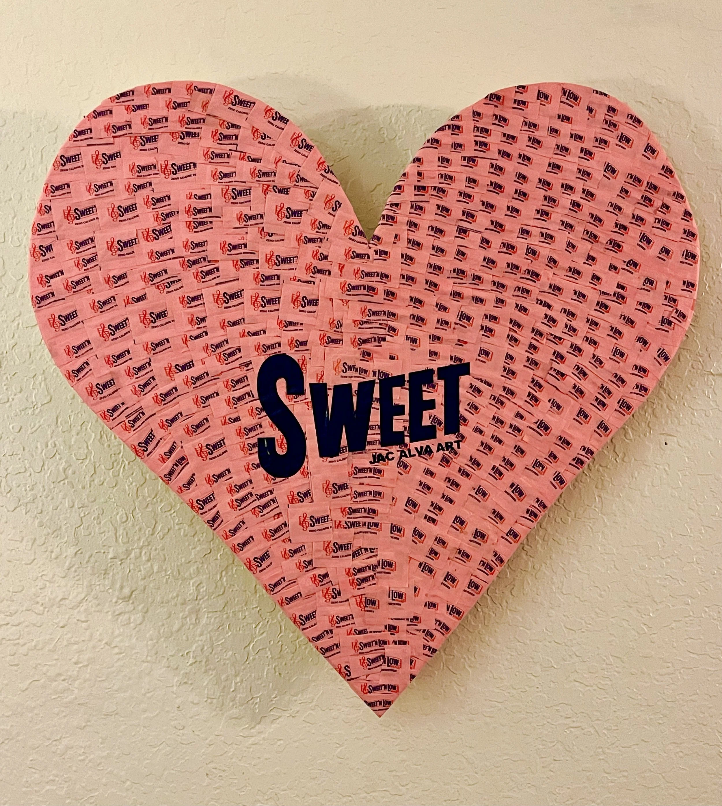 Jac’s latest body of work, “Sugar Rush,” a collection of painted collages containing upcycled trash such as used sugar and alternative sweetener packets, has helped her reconcile with the past, while coping with anxiety about the future. Each collage is comprised of a painted background that matches the various colors of these waste particles. The collection contains hundreds of pieces of trash, meticulously cared for through cleaning, flattening, and gluing onto the canvas in various directions. Jac’s rhythmic layering, use of unusual media, and preference for vibrant colors channel her anxieties about climate change, hoarding, and mass consumerism into a playful platform.