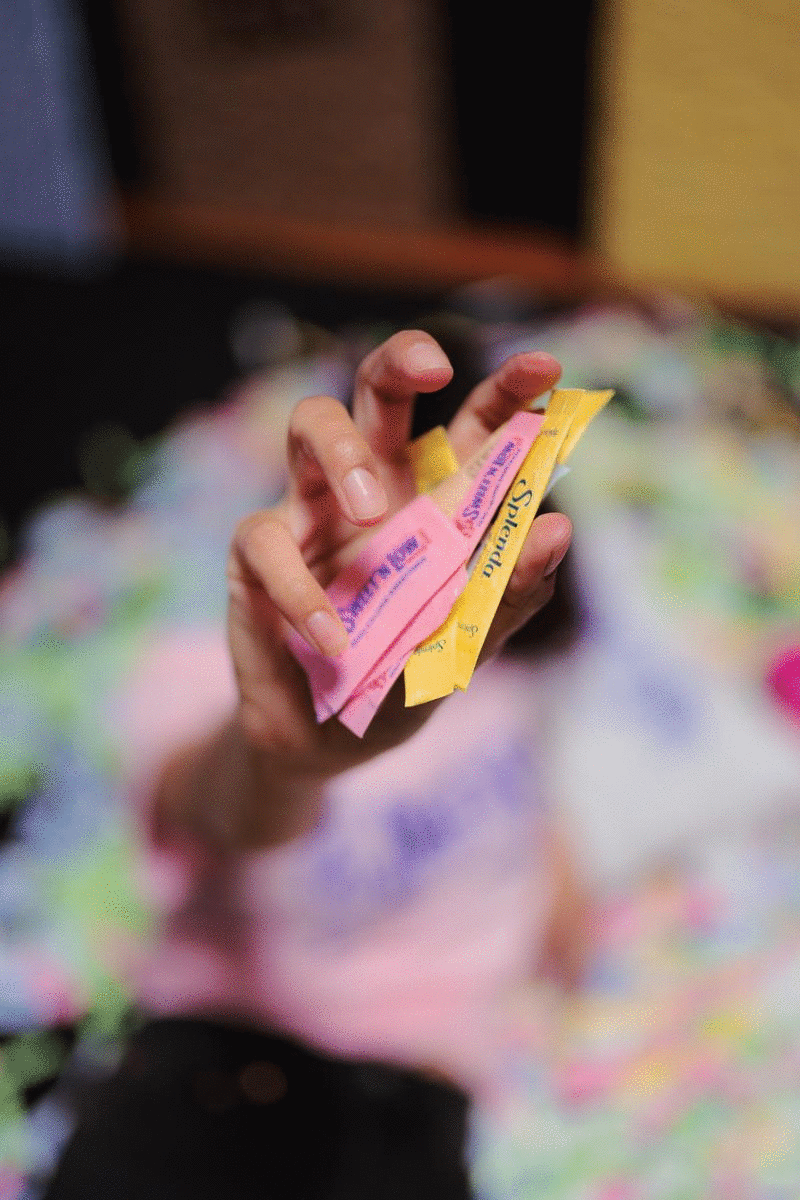 Jac integrates a variety of sugar and artificial sweetener packets in her painted collages.